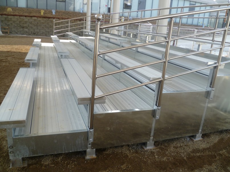 조립식관람석, 알루미늄벤치형 제품안내 형태 : 일반형좌석형태 : 알루미늄 금형 좌석통로판 : 알루미늄 금형 통로판후면 가림판 : 아연도판 마감측면 가림판 : 아연도판 마감난간대 : 스테인레스 스틸특징 : 알루미늄과 스테인레스 자재로 이루어져 부식이 없다 목록